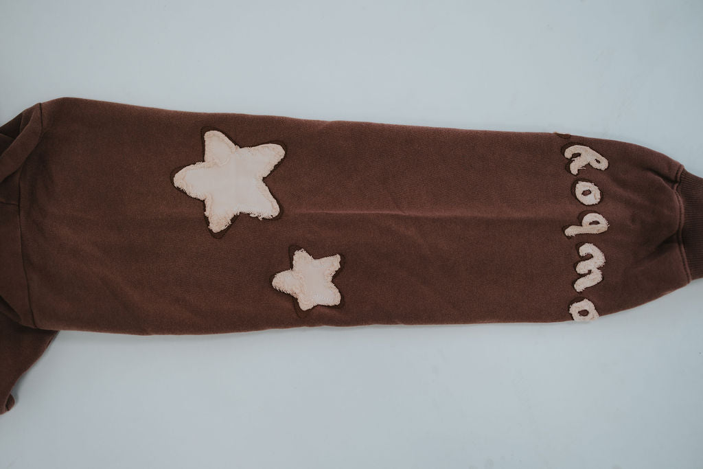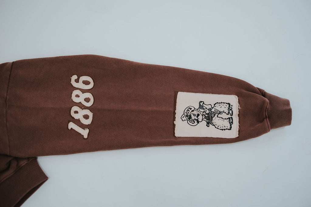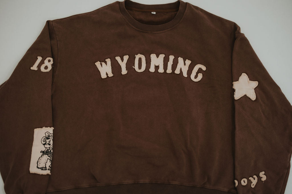 Meet the Acid Wash Cowboy Crewneck — the worn-in, lived-in version of your favorite cowboy classic. This rich brown acid wash sweatshirt channels that sun-faded Wyoming grit, like it’s been through a few good rodeos and still looks better for it. Cream distressed embroidery spells out WYOMING across the chest, while the full-back bucking horse graphic makes a bold western statement. Patchwork sleeve details nod to our Wyoming heritage with 1886, stars, Pistol Pete, and “cowboys” lettering. Soft, oversized, and ready for wherever your trail leads.