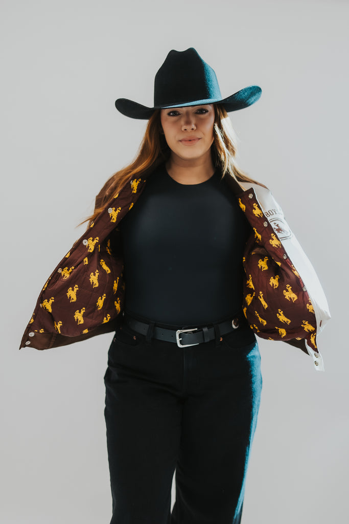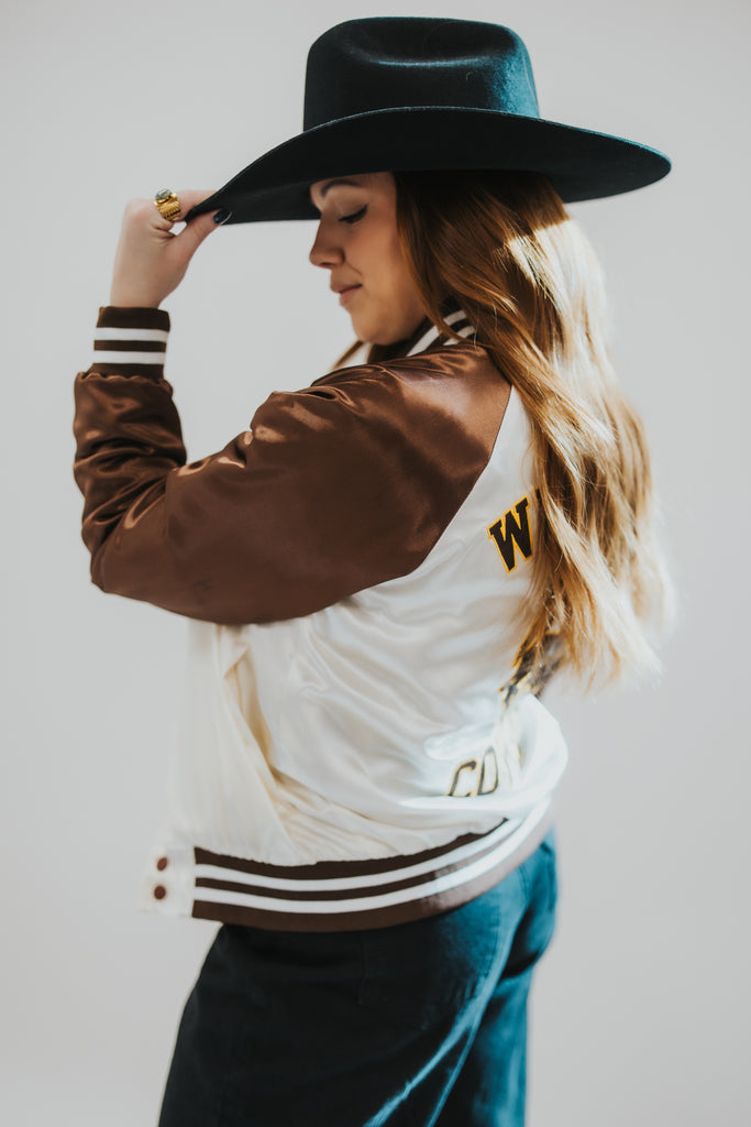 This nylon satin varsity jacket brings timeless collegiate style together with western grit. Designed with official University of Wyoming “Cowboys” and Bucking Horse trademarks, every detail was thoughtfully placed, from the bold back graphic to the embroidered sleeve hits and custom bucking horse interior lining.