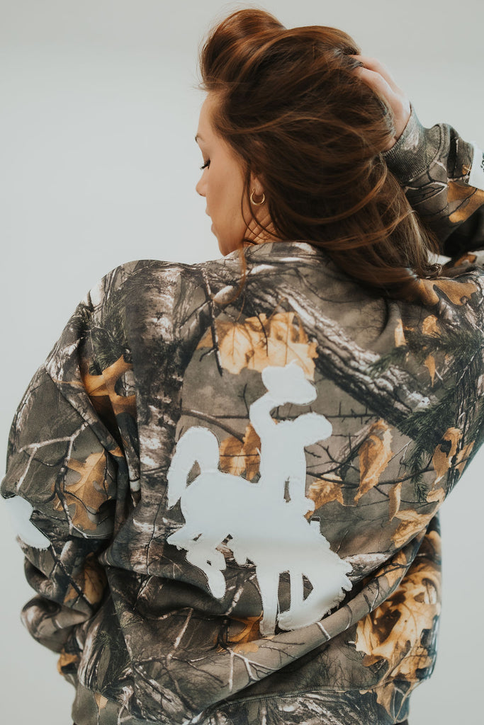 - Details: Distressed "WYOMING" cream embroidery on the front, patchwork sleeve details (“1886,” stars, “Cowboys” + Pistol Pete), large bucking horse on the back, new camo base pattern